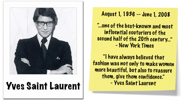 Yves Saint Laurent was born in Oran, Algeria, where he spent all of his youth. He began his long and illustrious fashion career in 1954, when he moved to Paris to attend the Chambre syndicale de la Haute Couture school. In Paris, he met Christian Dior and immediately became his assistant. Three years later, he took Dior's place when the older man passed away.